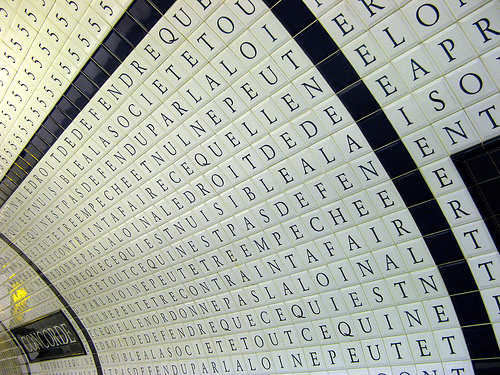 Οι τοίχοι του σταθμού έχουν γεμίσει με διακοσμητικά πλακάκια που σχηματίζουν ένα γιγάντιο παζλ λέξεων. Κάθε πλακάκι ένα γράμμα και όλα μαζί σχηματίζουν λέξεις από τη Διακήρυξη των Ανθρώπινων Δικαιωμάτων της Γαλλικής Επανάστασης του 1789.