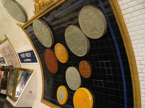 Μεγάλα αντίγραφα νομισμάτων διακοσμούν τους τοίχους και το ταβάνι του σταθμού βάζοντας σας στο κλίμα του Νομισματικού Μουσείου που βρίσκεται κοντά.