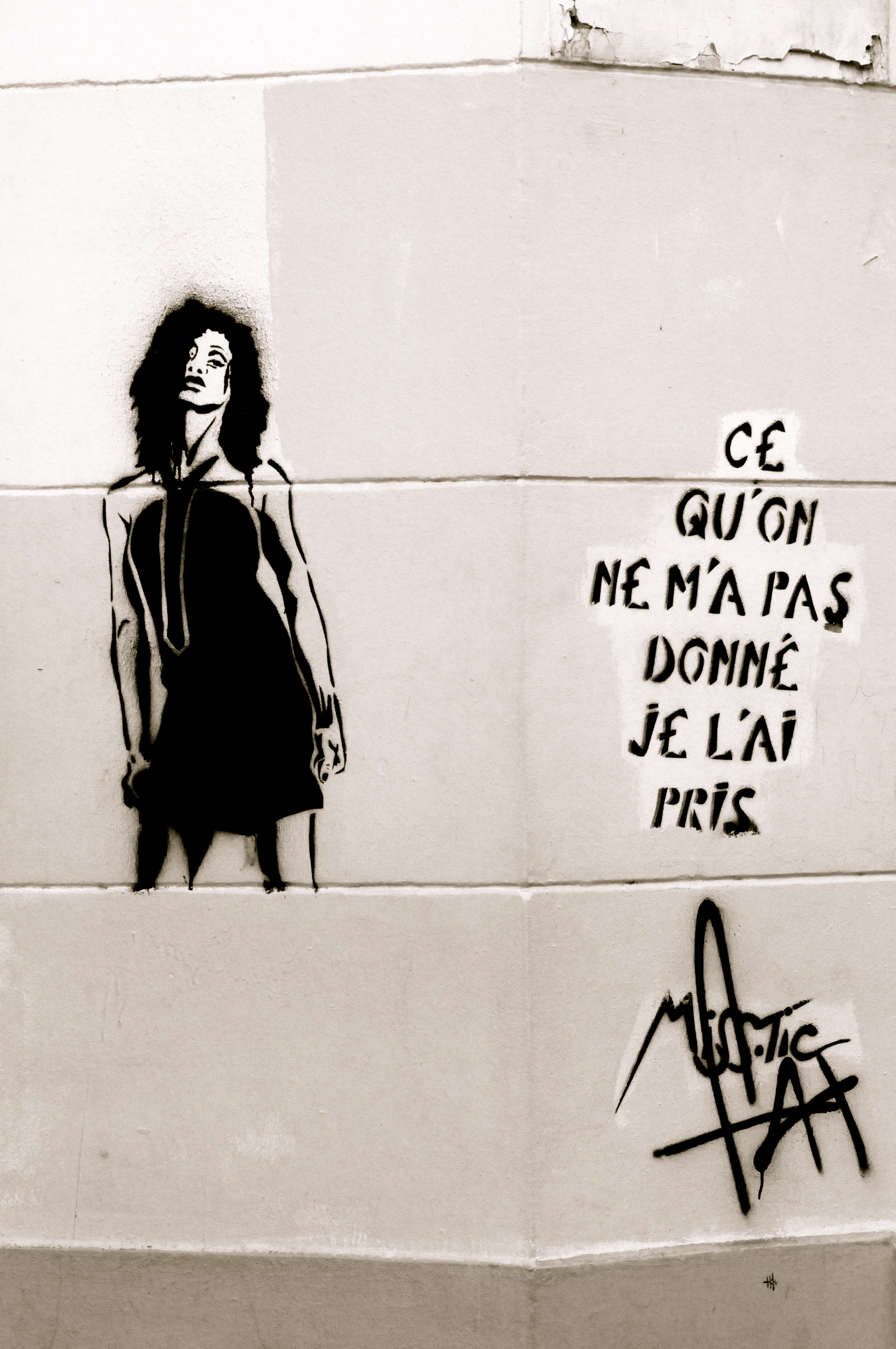 Η Miss.Tic θέτει τους δρόμους του Παρισιού στην υπηρεσία της τέχνης της και παίζει με τις λέξεις. «Το πάθος καταβροχθίζει το χρόνο, η αγάπη τον απολαμβάνει». «Το να κατέχεις σημαίνει να κατέχεσαι». Της αρέσει να μεταμορφώνει τη σημασία των προτάσεων… «Το να γίνεις απλός, είναι περίπλοκο». «Αυτός που μας ανοίγει τα μάτια μας κάνει τυφλούς». «Αν μου έλεγες τη δίψα σου, αυτό θα ηρεμούσε τη δική μου;»