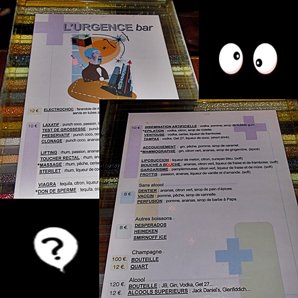 Σας προειδοποιώ πως το κλίμα είναι λίγο έως πολύ φοιτητικό.. (κάτι τέτοιες ώρες παίρνω ύφος εξηντάρας και κουνώντας το κεφάλι αναρωτιέμαι «Πως περνούν έτσι τα χρόνια») αλλά αξίζει να πάτε μια φορά για την πλάκα σας και να θυμηθείτε πως είναι να πίνεις από μπιμπερό (ομολογουμένως δυσκολεύεσαι στην αρχή αλλά όπως φάνηκε είναι σαν το ποδήλατο, δεν το ξεχνάς ποτέ!). Αν ανήκετε στη συνομοταξία των ιατρικών επαγγελμάτων και κατά συνέπεια στο Urgence Bar νιώθετε στο φυσικό σας περιβάλλον, θα πρέπει να σας αποκαλύψω την «αλχημεία» του! Κάθε Τετάρτη μειωμένες τιμές προορίζονται για γιατρούς, νοσοκόμες, φαρμακοποιούς, πυροσβέστες και ναυαγοσώστες με μόνο αντάλλαγμα να εμφανιστούν με τις στολές εργασίας. Κουράγιο κύριε ναυαγοσώστη! Για τους υπόλοιπους κοινούς θνητούς, αρκεί να έχετε χτυπήσει σε κάποιο εμφανές σημείο κι ένα cocktail θα σας προσφερθεί δωρεάν για να απαλύνει τον πόνο σας! Ε, στην ανάγκη δέστε έναν επίδεσμο στο χέρι ή καλύψτε το μάτι σαν πειρατής! Πάρτε πονεμένο ύφος και ρωτήστε:
