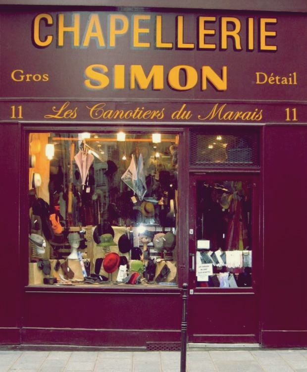 Στην καρδιά του Παρισιού, στην ιστορική συνοικία Marais, βρίσκεται από το 1950 το καπελάδικο Simon. Αυτό το μαγαζάκι των 30 m2 σίγουρα ενέπνευσε τον Claude Chabrol, να γυρίσει το 1982 στη Βρετάνη, την ταινία «τα φαντάσματα του καπελά» (les Fantômes du chapelier). Μικρό αλλά θαυματουργό αν σκεφτείτε ότι μπορείτε να διαλέξετε από μια μεγάλη ποικιλία από τα ψάθινα καπέλα panama ή fedora hats, basebal caps, flat caps που έχει κάνει μόδα ο Brad Pitt, μπερέδες, τραγιάσκες και κασκέτα.