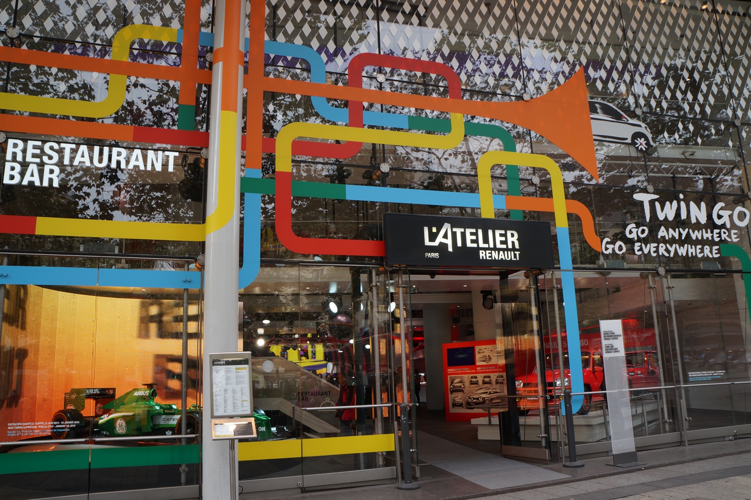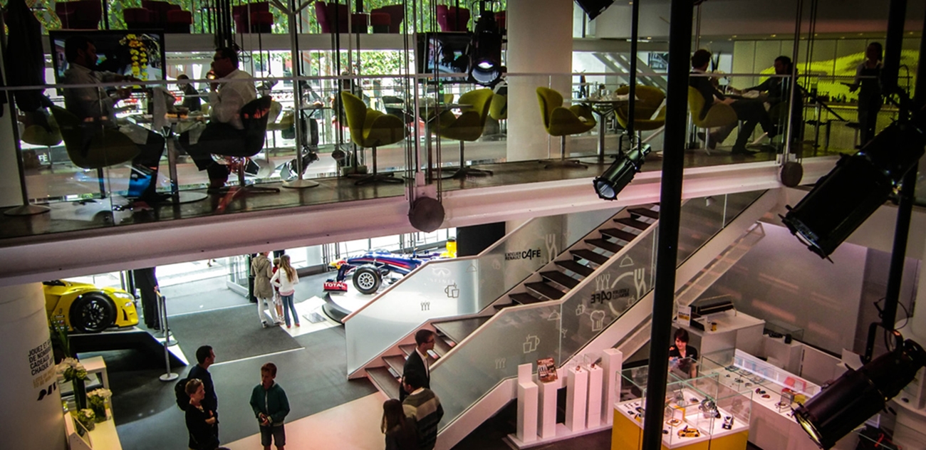 Θα μπορούσε να είναι μια εκδοχή του αντρικού παραδείσου. Το Atelier Renault είναι ένας χώρος που παρουσιάζει μια σειρά από αυτοκίνητα τόσο από τα τρέχοντα μοντέλα όσο και από τα ιστορικά. Μπροστά στη βιτρίνα φυσικά δεσπόζει επιβλητική η Formula 1. Τα μοντέλα είναι παραταγμένα με τέτοιο τρόπο ώστε να νομίζεις πως βρίσκεσαι σε μια γκαλερί τέχνης, ενώ μια τρίχρωμη έκθεση γιορτάζει τη Γαλλική δημιουργικότητα. Το Background είναι ένα μοναδικό showcase από οχήματα της μάρκας όλα σε κόκκινο, άσπρο και μπλε σαν τη Γαλλική σημαία. Το παιχνίδι είναι να ανακαλύψετε εκ νέου χαρακτηριστικά γαλλικά αντικείμενα χαραγμένα στη μνήμη (όπως ο μπερές, η μαρινιέρα, το γαλλικό μουστάκι, οι παντόφλες charentaise κ.α), μέσα από τον πρωτότυπο συνδυασμό τους με τα αυτοκίνητα. Για παράδειγμα το μοτίβο από τις παντόφλες charentaise χρησιμοποιείται για ένα μικρό αγωνιστικό αμάξι. Ένας εξωτερικός καθρέφτης αυτοκινήτου μετατρέπεται σε καθρεφτάκι ομορφιάς σε γαλλικό μπουντουάρ. Μπορείς επίσης να πιείτε κάτι στο bar ή να απολαύσετε ένα γεύμα βλέποντας από τον ημιώροφο τα αυτοκίνητα.