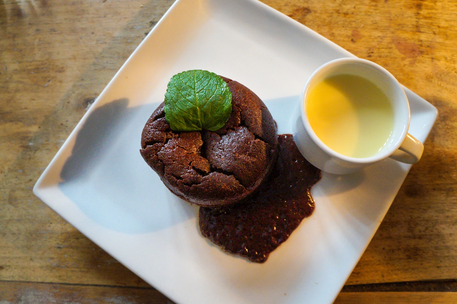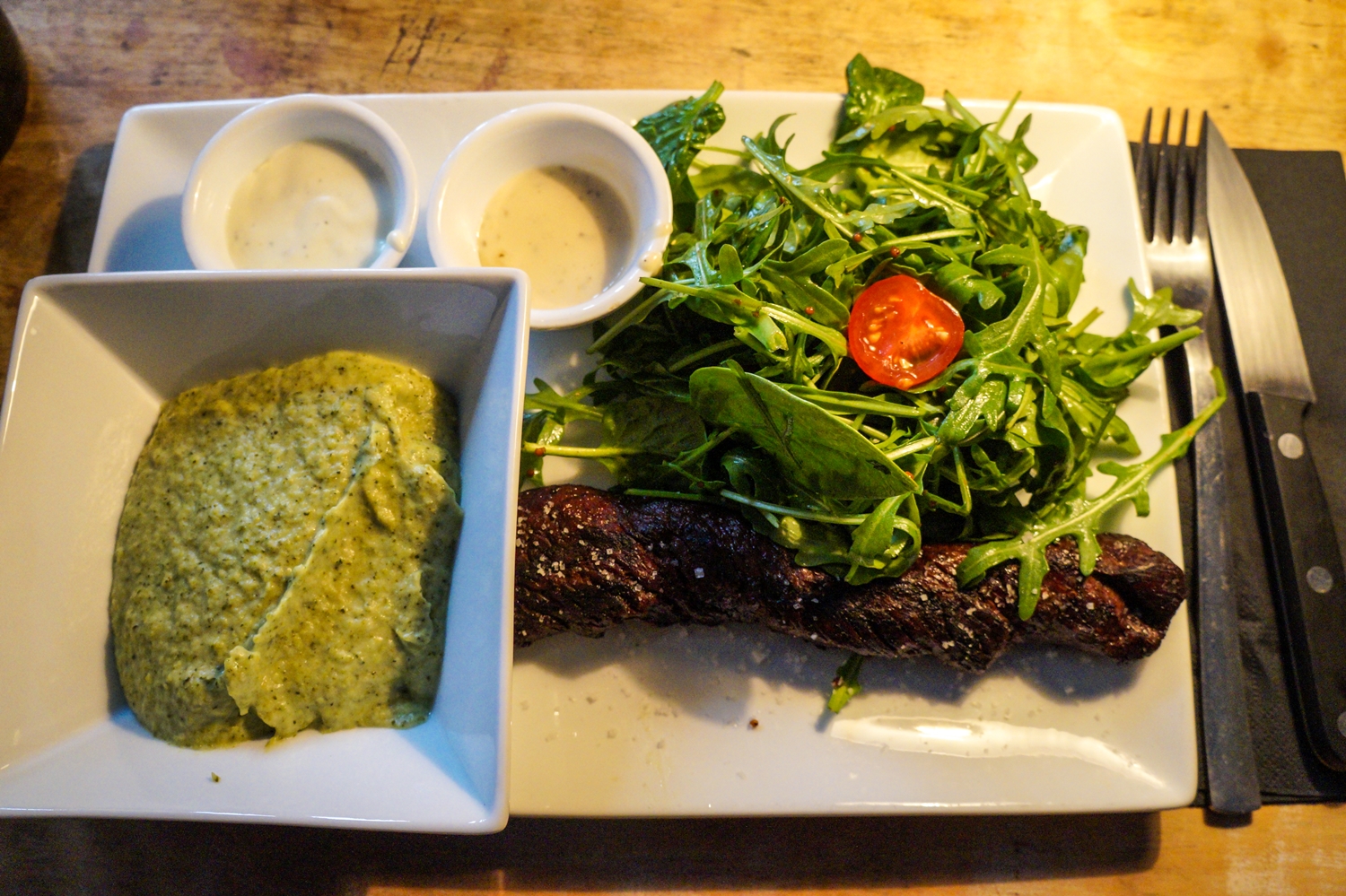 Ο σερβιτόρος μου πρότεινε τη μερίδα που έχει μικρότερη ποσότητα κρέατος (με είδε ότι δυσκολεύτηκα) συνοδεία από πατάτες τηγανιτές ή ψητά λαχανικά ή σαλάτα και ένα ποτήρι κρασί το οποίο και κόστιζε λιγότερο, ήτοι 11,50 ευρώ (Τώρα οι πολύ φαγανοί θα θέλετε την κανονική μερίδα σίγουρα του συγκεκριμένου πιάτου που κοστίζει 16,50). Τελικά πήρα το σαλατικό και έναν πουρέ από μπρόκολο (κ-ο-λ-α-σ-μ-έ-ν-ο!). Θα παραδεχτώ πως πριν έρθει στο πιάτο μου κατέφτασαν στο διπλανό τραπέζι 2 πιάτα τηγανιτές πατάτες οι οποίες μύριζαν τέλεια και φαίνονταν πολύ σον σον. Αργότερα διάβασα πως το μαγαζί φημίζεται και για τις french fries του, πέρα από το κρέας και τις ποικιλίες κρασιών. Την επόμενη φορά θα παίξει δαγκωτό τηγανιτή πατάτα! Ευτυχώς πρόλαβα να φωτογραφίσω το πιάτο μου, γιατί στο τέλος δεν έμεινε τίποτα. Το κρεατάκι νοστιμότατο αν και παραψημένο (αναμενόμενο, βέβαια), όσο για τον πουρέ τα είπαμε, μην τα ξαναλέμε και ξυπνήσει το ένστικτο της πείνας (είναι νωρίς για βραδινό). Φυσικά πήραμε και επιδόρπιο και βουτήξαμε στη σο-κόλαση!