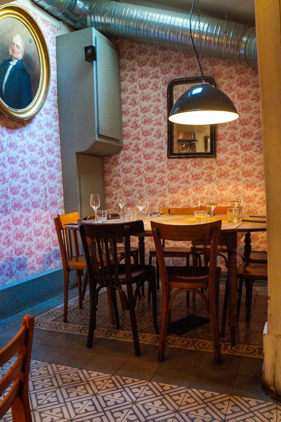 Αγαπητό μου παριζιάνικο food diary… για πρώτη φορά έφαγα κρέας σε εστιατόριο στην πόλη του φωτός και πραγματικά μου άρεσε. Αυτό χρειάζεται #celebration. Όχι τίποτα άλλο αλλά είχα αρχίσει να νιώθω και περίεργη (Ποια, εγώ;). Όμως προτού περάσω στο παρασύνθημα (το φαγητό φυσικά) θέλω να πω για το ambiance (aka διακόσμηση) που με έκανε να νιώσω πως βρίσκομαι στο σπίτι κάποιου συγγραφέα της δεκαετίας του ’50. Vintage ταπετσαρία και τσιμεντοπλακάκια συνδυασμένα με ξύλο με παλαιωμένη όψη, τόσο στο δάπεδο όσο και στα έπιπλα, πολλά παλιά βιβλία και κάδρα με προσωπογραφίες κοσμούν το εστιατόριο L’Aller Retour, προσφέροντας αυτή την αίσθηση της οικειότητας και της σπιτικής ζεστασιάς.